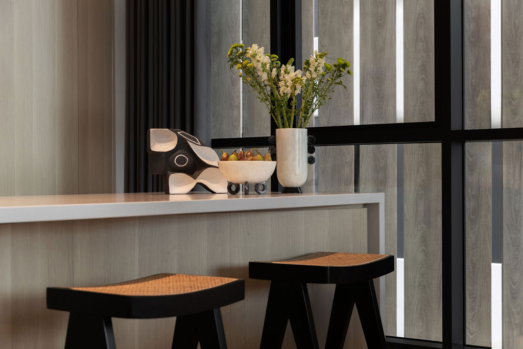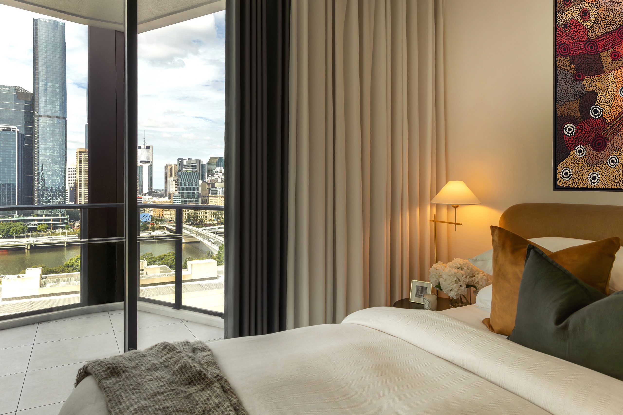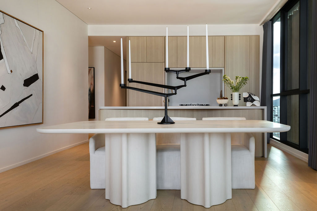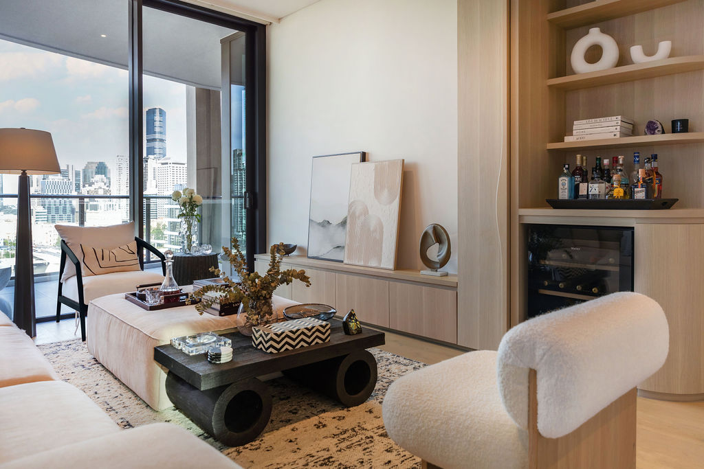 In this South Brisbane apartment, panoramic city views are met with composure rather than spectacle. Interior decoration responds to the architectural framework with restraint, allowing the surrounding urban scale to be experienced through calm, tactile spaces that feel ordered, tactile, and quietly sophisticated.