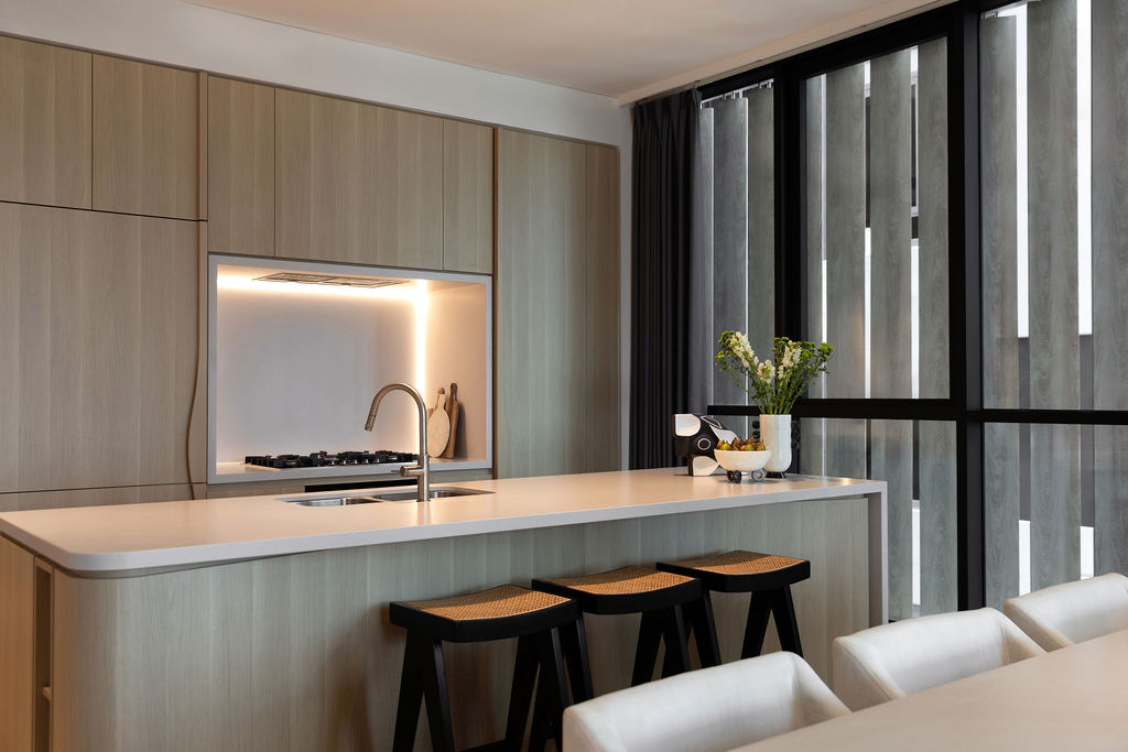 The architectural layout supports a clear balance between openness and privacy. Living areas extend naturally toward the view, supporting social interaction, while private rooms maintain a sense of containment and ease. Throughout, careful attention to scale, texture and surface creates a sense of resolution. The result is an interior that feels assured and enduring — one that values balance and restraint, where refinement emerges through careful control rather than overt statement.